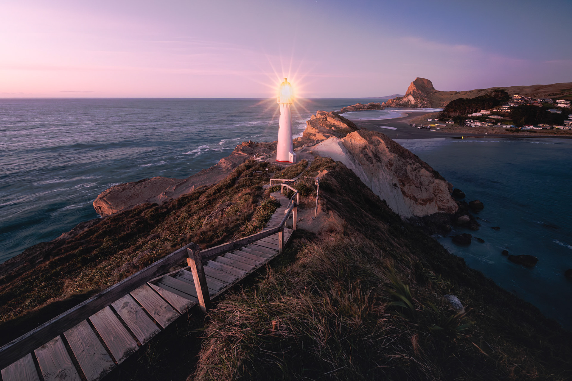 Castlepoint Lighthouse shines through its last moments right after the sun started to rise. The short moment the two separate light meets.